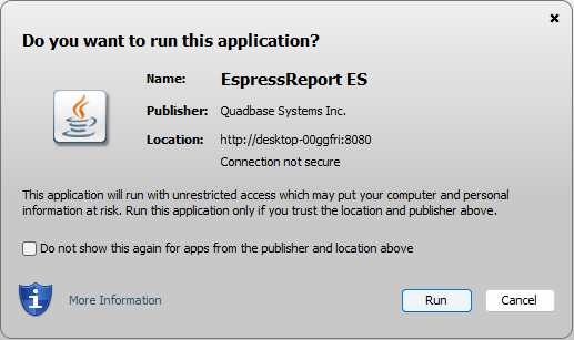 The Java executable file will be downloaded as shown below. Launch it and click “Run”.