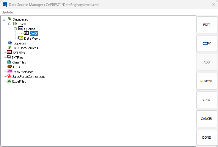 By using these various JDBC drivers and the Data Registry Manager in EspressReport ES, you can access data from all kinds of data sources in the Cloud and SaaS applications for robust reporting and visual analytics. Please download the Excel file here and copy to the directory (C:\ERES71\help\examples\DataSources\excel\) if you would like to follow the example.