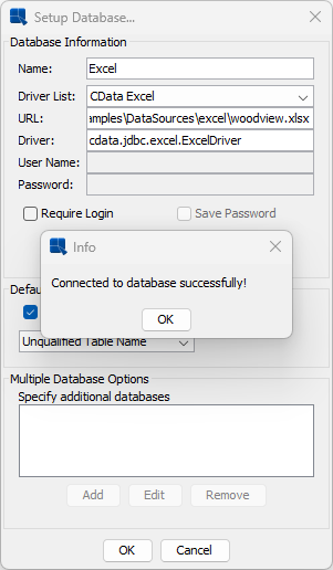 Then enter the JDBC URL: “jdbc:cdata:excel:ConnectOnOpen=true;TypeDetectionScheme=RowScan;RowScanDepth=10;URI=C:\ERES71\help\examples\DataSources\excel\woodview.xlsx”