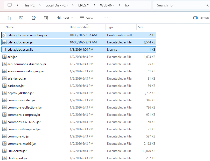 Copy “cdata.jdbc.excel.jar”, “cdata.jdbc.excel.lic” and “cdata.jdbc.excel.remoting.ini” into “C:\ERES71\WEB-INF\lib“.