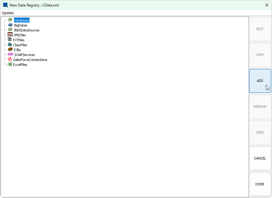 After creating the Data Registry, add a connection to the Database. Select Database and click ADD.